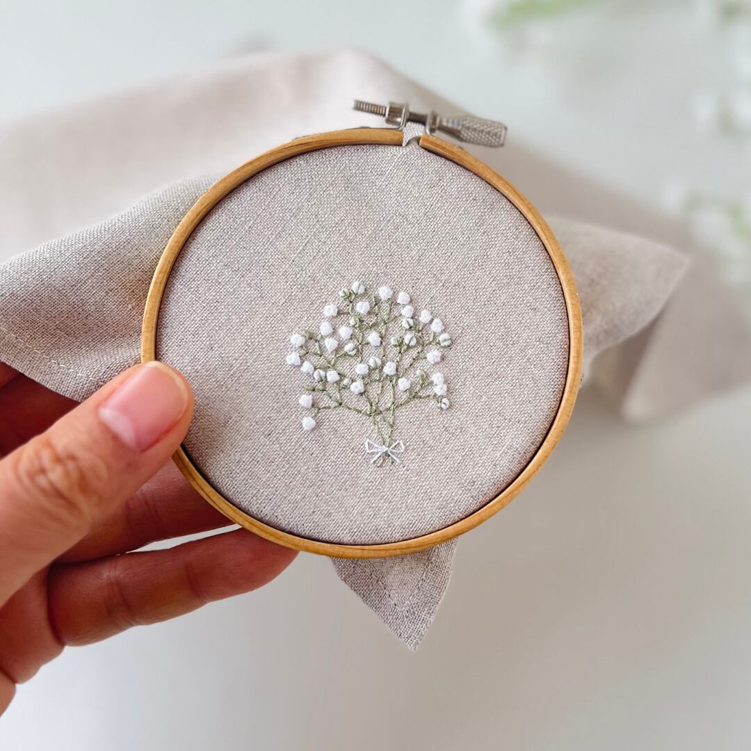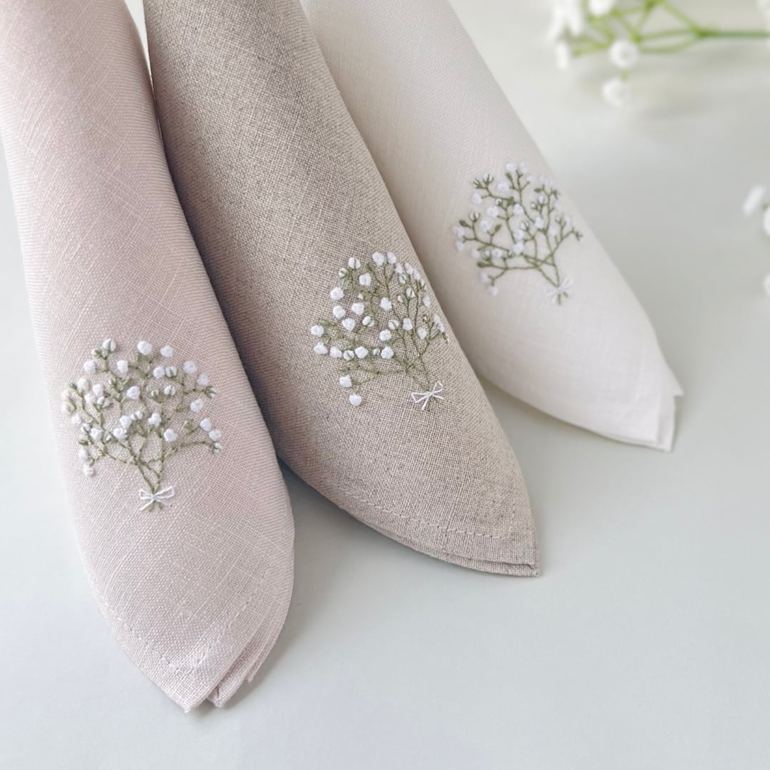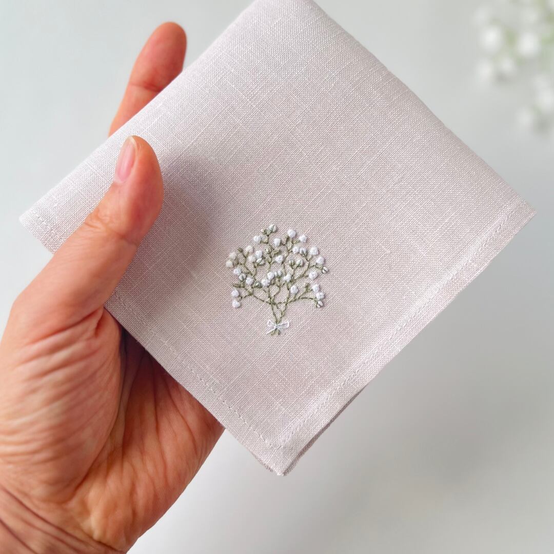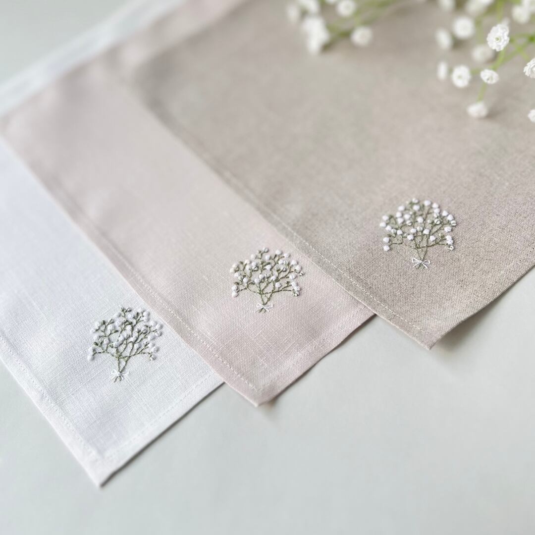 O様オーダー:ありがとうのかすみ草|ソフトリネンの手刺繍ハンカチ(選べる布色・サイズ・名入れ対応)